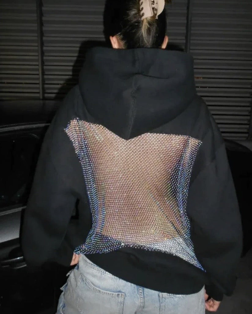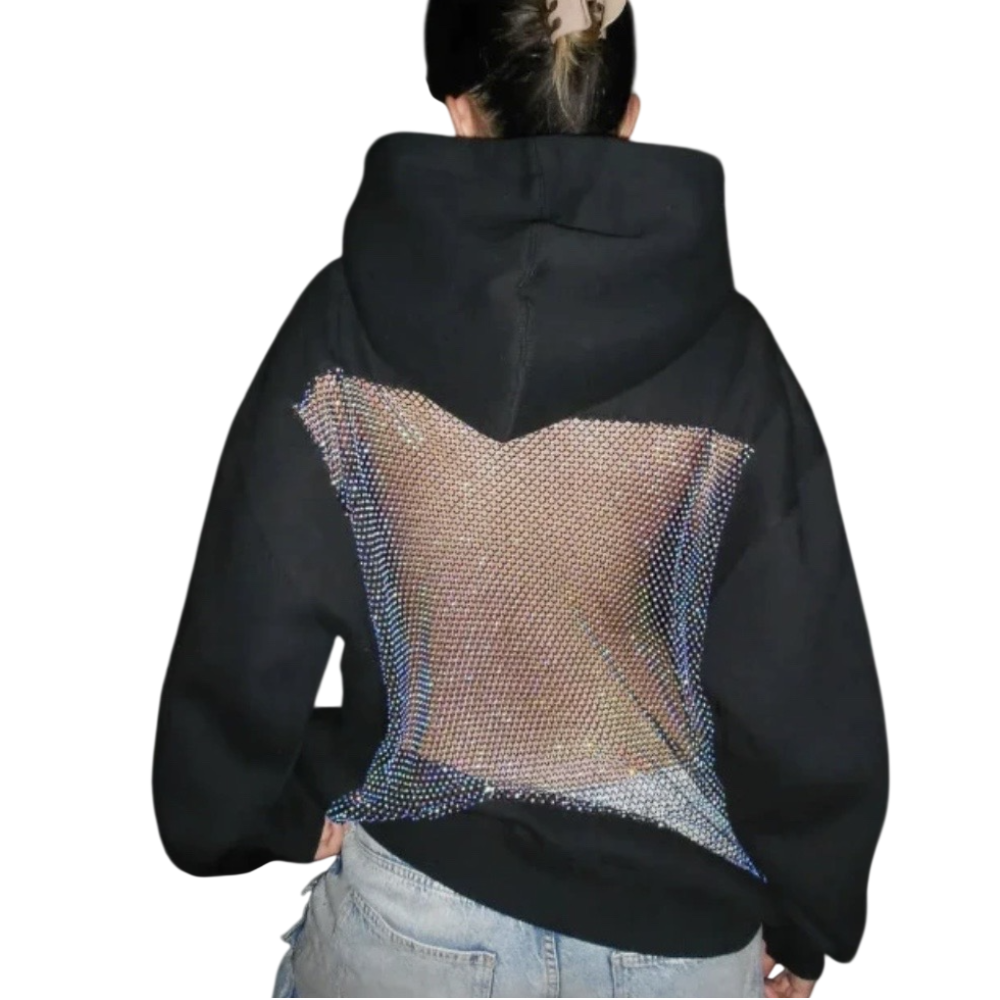 Felpa donna con cappuccio che unisce comfort e stile in modo originale. Morbida e comoda da indossare, si distingue per il retro in rete trasparente che aggiunge un tocco moderno e femminile senza risultare eccessivo. Un capo versatile, perfetto per dare personalità anche ai look più semplici!